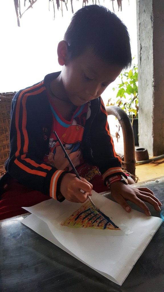 農場有豬,鴨,牛,雞,米,菜,芒果, 榴槤 等等, 沒有不勞而穫的晚餐,他們每天五點起床開始工作,用全身的肌肉打理農場。我也不想懶懶閑過日晨, 所以決定教當地小朋友學畫聖誕樹,一起「學藝」!