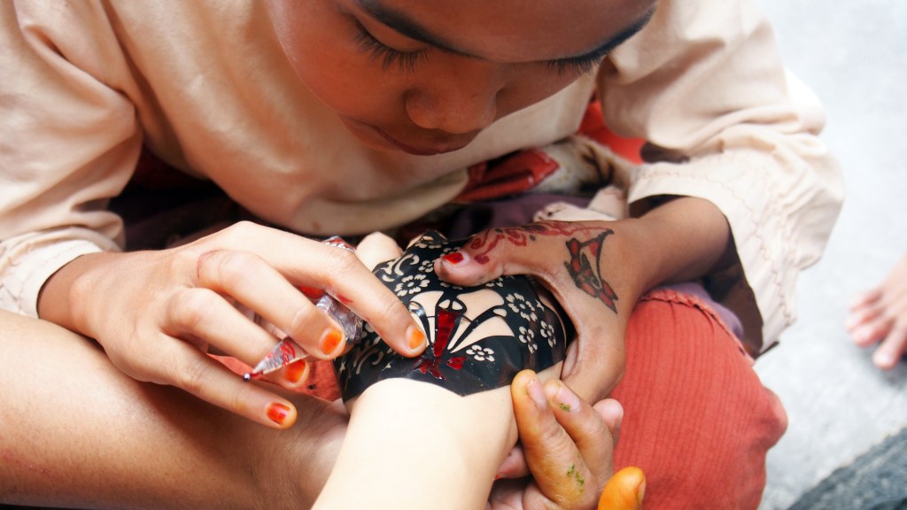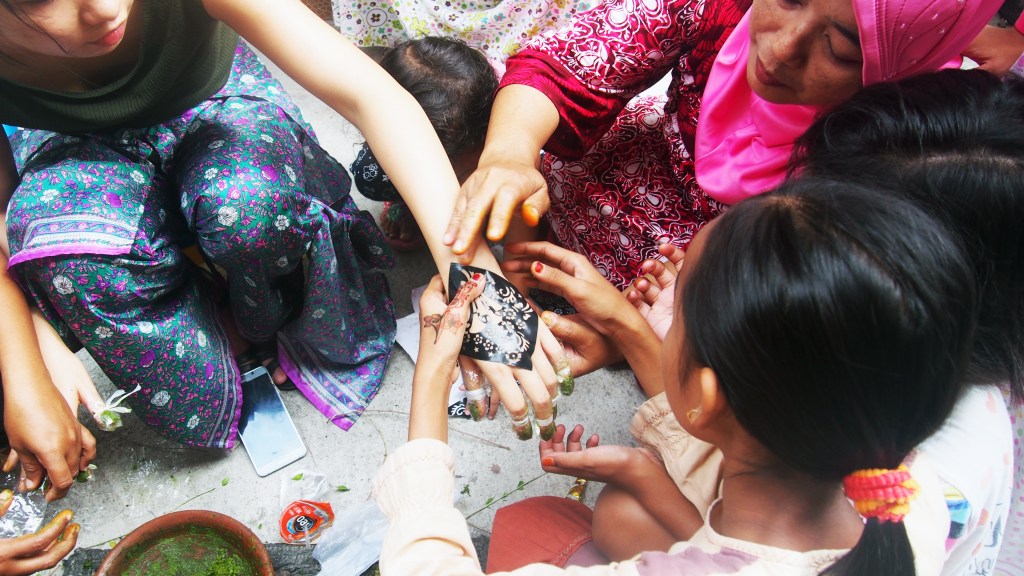 小朋友把自己買的 Henna gel 也拿出來在我的手上畫花紋 ! 我第一次被人畫Henna ! 好興奮 !!
