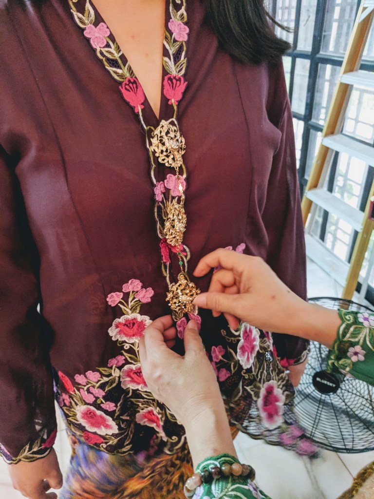 娘惹服沒有釦子, 我們會用美麗的胸針 (kerongsang)去定形。