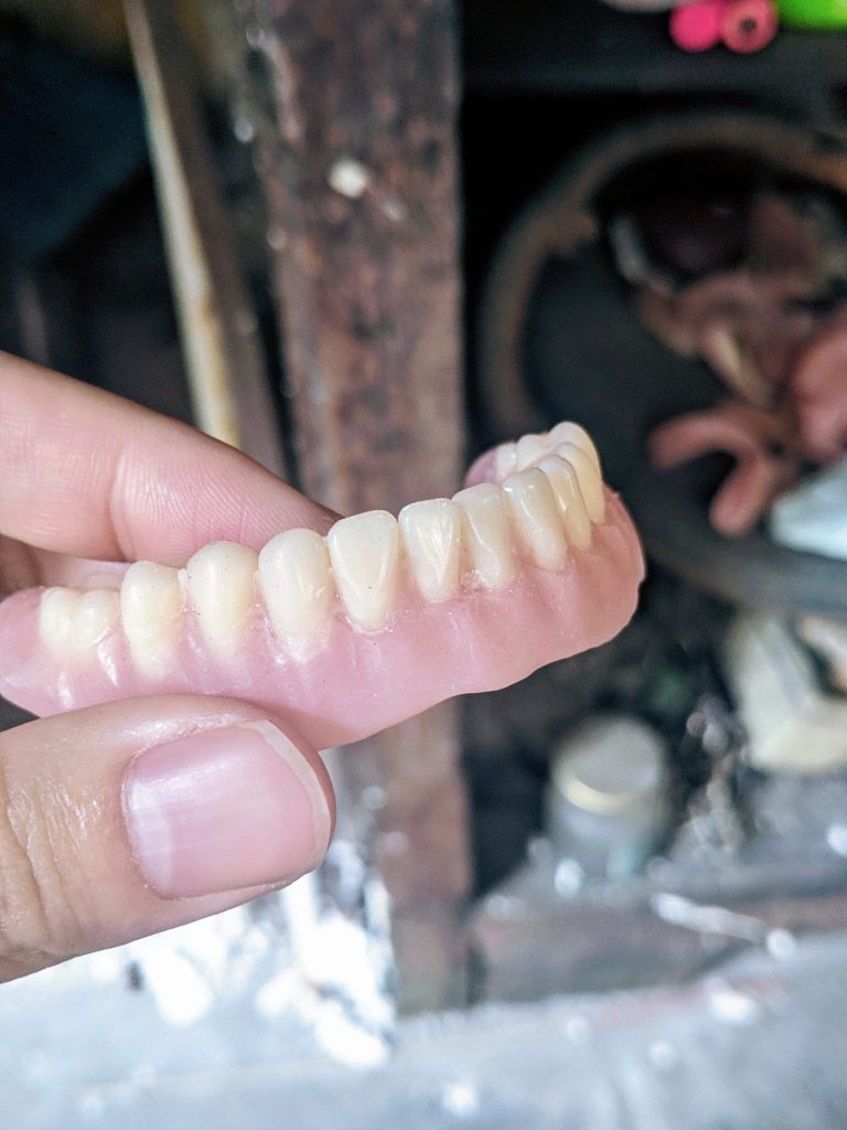 目測80歲的老牙醫當時休閒地聽收音機和看報紙,診所內沒有客人, 現在他主要的工作是人手製作假牙。